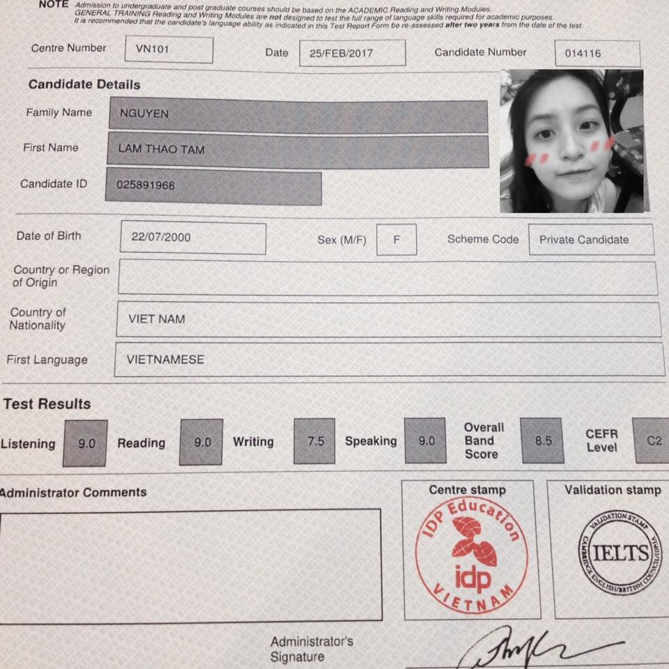 Mới đây, trên Facebook cá nhân cô bạn Nguyễn Lâm Thảo Tâm (sinh năm 2000, học sinh trường THPT Đinh Thiện Lý) đã khoe kết quả thi IELTS với số điểm đáng mơ ước, 8.5. Trong đó, điểm từng phần thi cụ thể Nghe: 9.0; Đọc: 9.0; Viết: 7.5 và Nói: 9.0.